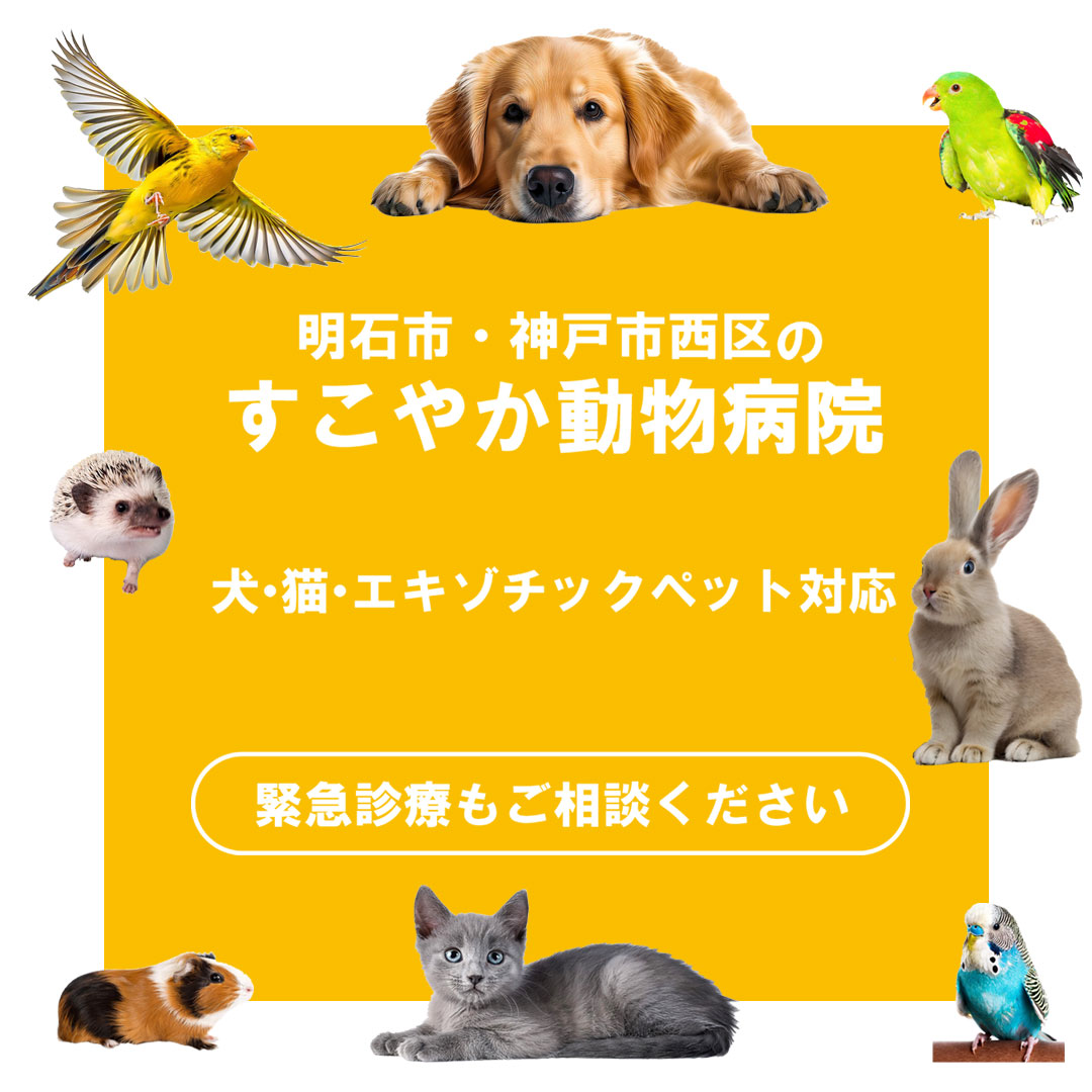 神戸市西区・明石市大久保町にあるすこやか動物病院は、犬・猫はもちろん、小鳥やげっ歯類などのエキゾチックペットの診療にも力を入れています。西洋医学を基本としながら、鍼灸や漢方、ハーブを取り入れた統合医療にも積極的に取り組み、ペットの体への負担が少ない治療を心がけています。